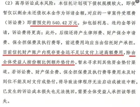 公告明确披露,该信托项下债权规模较大,即便只按未偿还本金部分起诉,一审案件受理费就需要预交约 540.42 万元;如果将利息、违约金等一并主张,诉讼费用还会更高。