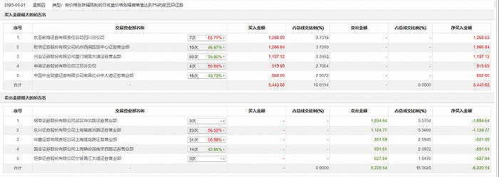 具体来看,东亚前海证券四川分公司、财信证券杭州西湖国贸中心证券营业部分别买入1268.03万元、1266.84万元;招商证券武汉中北路证券营业部、东兴证券上海肇嘉浜路证券营业部分别卖出1894.64万元、1124.77万元。