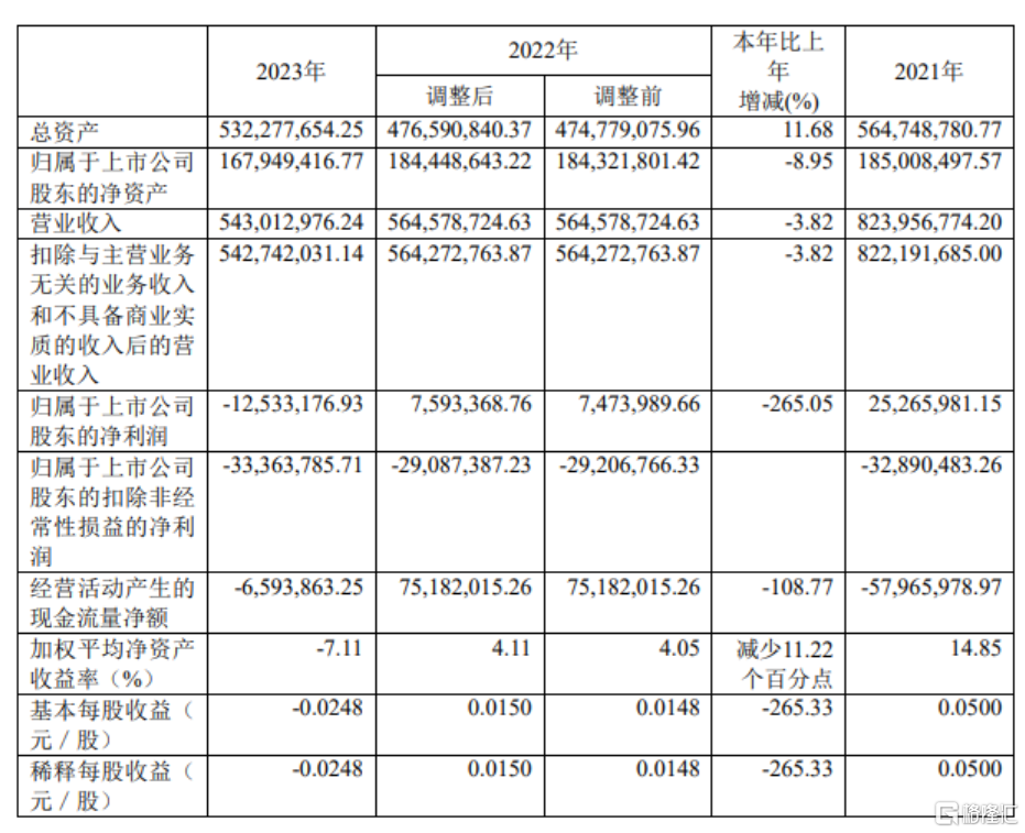 然而到了2022年,业绩出现急剧下滑,营业收入降至5.65亿元,同比下降31.48%,净利润也锐减至747.4万元,同比下降幅度高达70.42%。进入2023年,颓势仍在延续,营业收入为5.43亿元,较2022年同比减少3.82%,净利润更是由盈转亏,达到亏损1253.32万元。