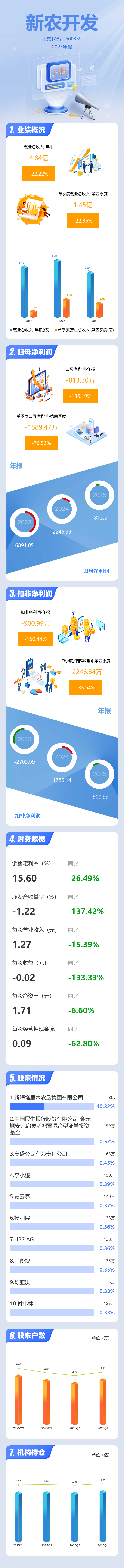 新农开发2025年年报显示,当年度公司主营收入4.84亿元,同比下降22.22%;归母净利润-813.3万元,同比下降136.19%;扣非净利润-900.99万元,同比下降150.44%;其中2025年第四季度,公司单季度主营收入1.45亿元,同比下降22.86%;单季度归母净利润-1889.47万元,同比下降76.56%;单季度扣非净利润-2246.34万元,同比下降35.65%;负债率54.1%,财务费用530.17万元,毛利率15.6%。