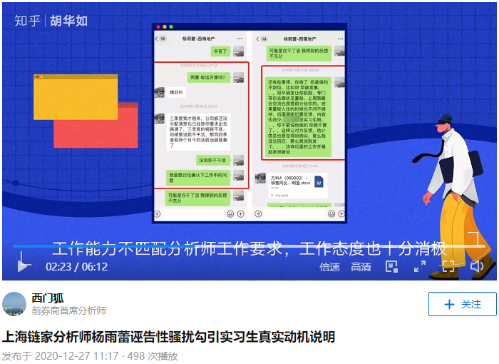此外,杨梦琛律师还提到,2020年12月26日,胡华如在搜狐网上发表了文章《杨雨蕾故意诬告情况说明》等内容。这篇文章包含了“杨雨蕾主动加本人微信,并发送其个人简历,后发现其简历显示在东北证券的行研经历为三年,而中国证券业协会查询的信息显示只有九个月”“杨雨蕾在西南证券贡献的佣金完全无法覆盖其个人工资支出,工作能力不匹配分析师工作要求,工作态度也十分消极”等对杨雨蕾工作经历事实的描述以及能力的评价内容,如果没有相应足够的证据支持上述事实的话,则存在胡华如以诽谤、侮辱等方式侵害他人名誉权的可能。