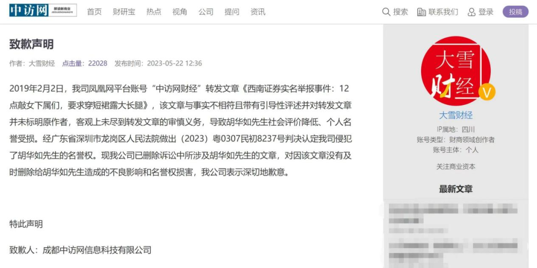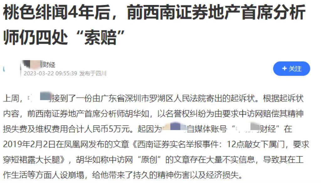 我公司旗下的公众号当年因为关注过“西南证券性骚扰疑案”,也因此卷入名誉侵权案,得以比大众更深入的了解到实名举报人和被举报人如今面临的处境。