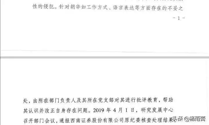 这件事在社交媒体上一曝光,西南证券就成立了调查组。根据判决书可知,西南证券纪检检察组曾给法院回函称:针对胡华如工作方式、语言表达等方面存在的不妥之处,由其所在部门负责人及党支部对其进行批评教育,帮助其认识并改正自身存在问题。但是该公司内部调查组并未认定胡华如存在性骚扰杨雨蕾及其他女同事的情况。