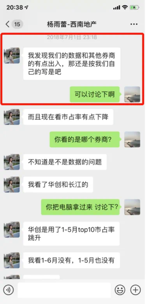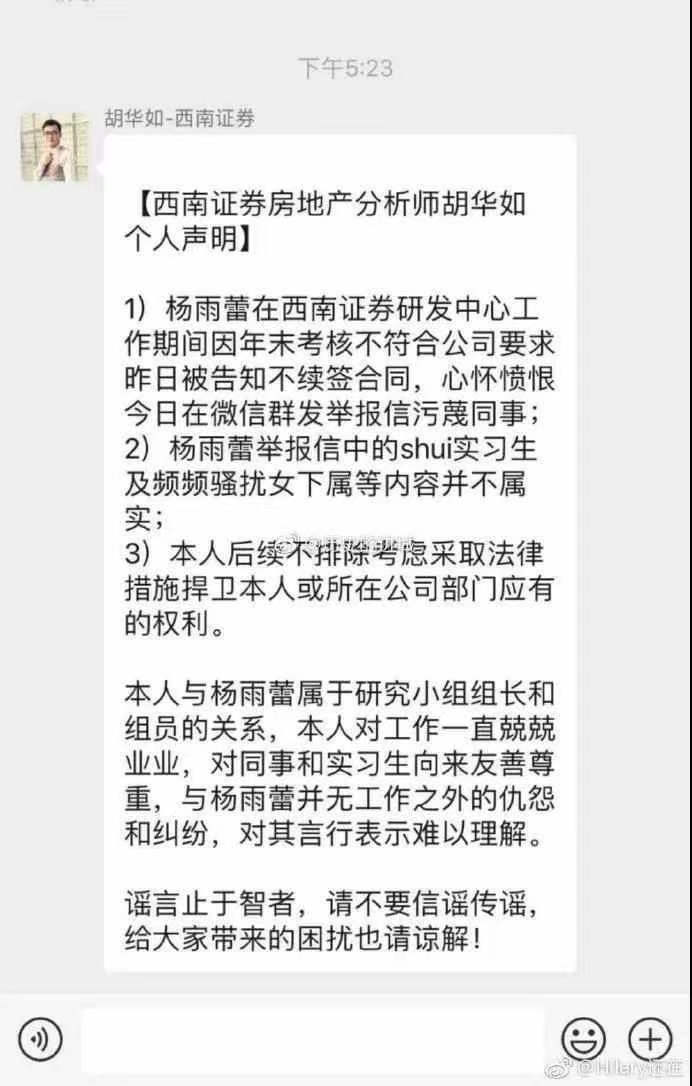 事情还要从2019年1月说起,西南证券研究发展中心房地产研究小组的杨雨蕾在“西南华夏核心研究群”等多个微信工作群及朋友圈发布“【实名举报】西南地产胡华如常年勾引实习生”实名举报信息。
