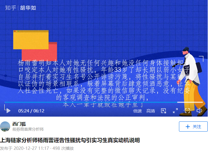 另外,在《民法典》2021年1月1日生效之后,胡华如还在知乎等平台发布了相关视频、文章,杨梦琛律师表示:“如果胡华如是在未经杨雨蕾同意的情况下,使用杨雨蕾的照片,则胡华如的行为有可能亦涉嫌侵犯杨雨蕾的肖像权。”