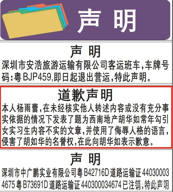 最终,2021年7月1日,杨雨蕾在《深圳商报》B11版面刊登了给胡华如的正式道歉声明。
