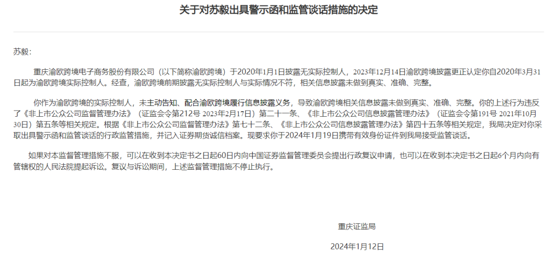 重庆证监局指出,渝欧跨境于2020年1月1日披露公司无实际控制人;2023年12月14日,渝欧跨境披露更正认定,苏毅自2020年3月31日起为公司实控人。