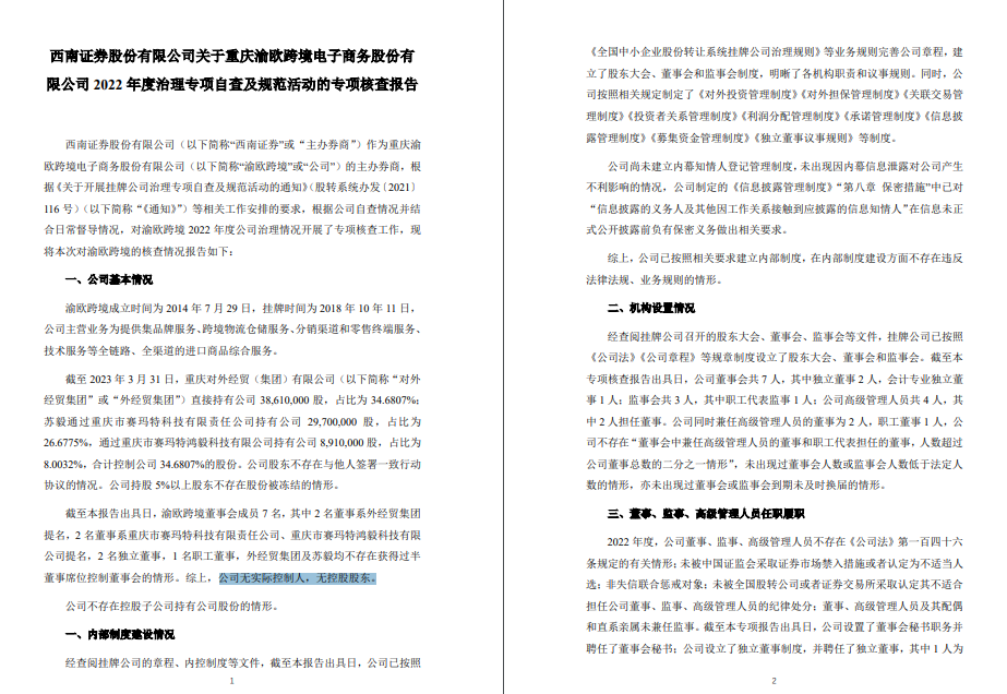 而在近三年时间里,渝欧跨境的临时公告和定期报告均宣称,“公司不存在实际控制人”。