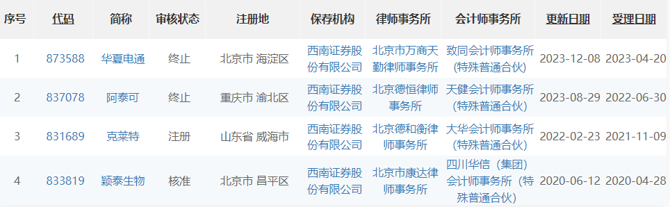 截至目前,西南证券在在北交所共有4单项目:颖泰生物已核准,克莱特已注册,阿泰可和华夏电通均是“已终止”。