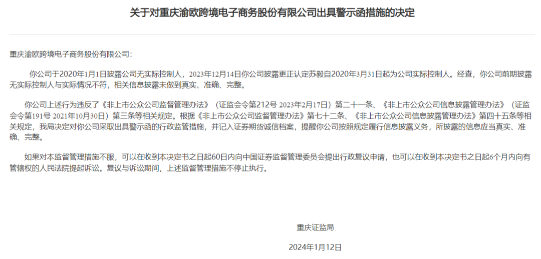 重庆证监局认定,渝欧跨境前期披露无实际控制人与实际情况不符,相关信息披露未做到真实、准确、完整。上述行为违反了《非上市公众公司监督管理办法》第二十一条、《非上市公众公司信息披露管理办法》第三条等相关规定。1月12日,重庆证监局对渝欧跨境采取出具警示函的监管措施,并记入证券期货诚信档案。