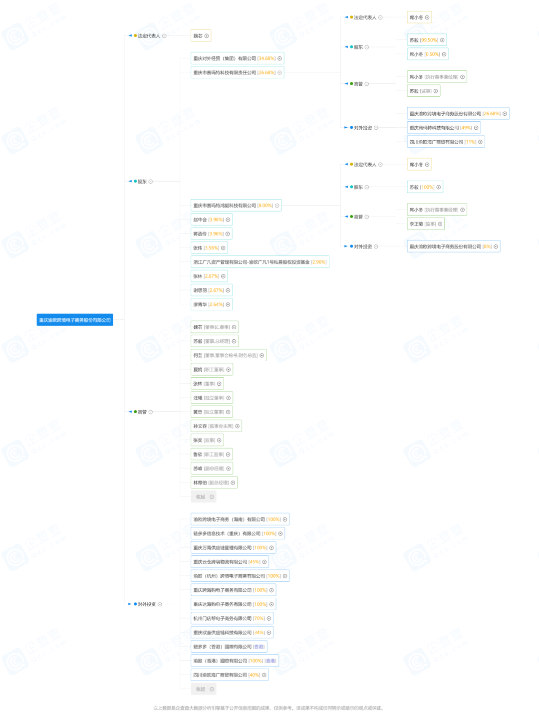 2019年12月,外经贸集团将渝欧跨境9%的股权(297万股)转让给重庆市赛玛特鸿毅科技有限公司(简称:赛玛特鸿毅)。由于苏毅持有赛玛特科技99.50%的股权,持有赛玛特鸿毅100%股权,两者构成一致行动人。