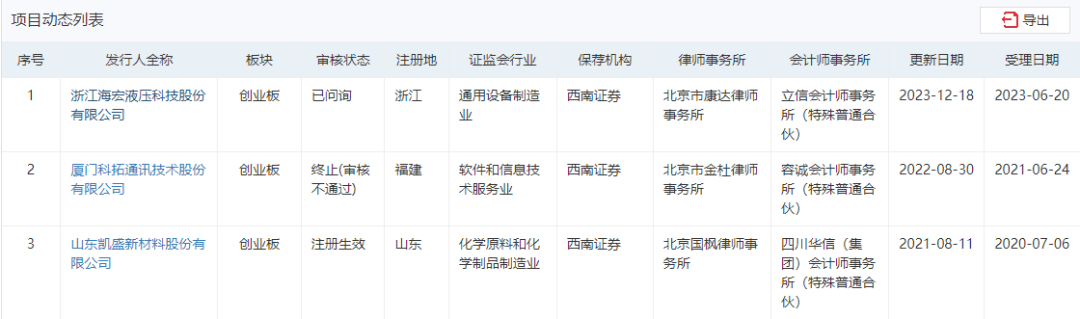 在上交所,西南证券没有IPO中的项目。而在深交所有3单项目,其中凯盛新材(301069.SZ)已敲钟上市;厦门科拓通讯技术股份有限公司(简称:科拓通讯)审核未过;浙江海宏液压科技股份有限公司(简称:海宏液压)近期已问询。