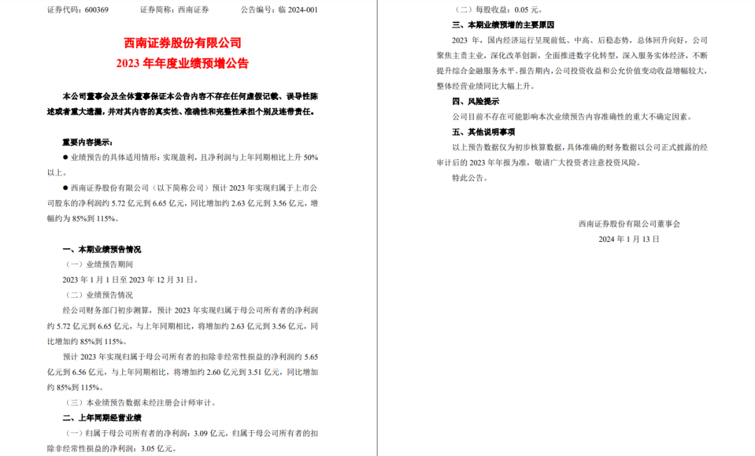新年伊始,西南证券率先发布了业绩预增公告:经初步测算,2023年归母净利润为5.72亿元到6.65亿元,同比增幅在85%至115%之间。