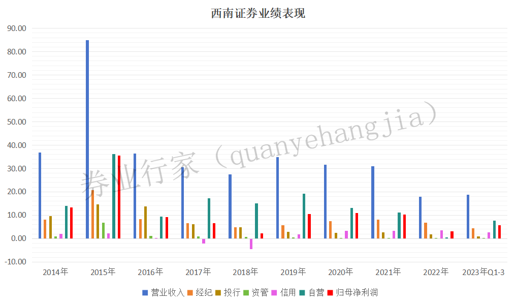 近年来,西南证券的投行业务未见起色。2019年到2022年,投行业务收入分别为2.95亿元、2.50亿元、2.67亿元。2023年前三季度,投行业务收入仅有1亿元,同比下降33.72%。
