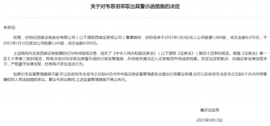 值得一提的是,2023年9月13日,西南证券股份有限公司董事韦思羽被重庆证监局出具警示函。其母亲于2023年5月9日买入公司股票1000股,成交金额4070元,于2023年5月10日卖出公司股票1000股,成交金额4000元,上述期间内买卖西南证券股票的行为构成短线交易的违规行为,相关情况被记入韦思羽个人证券期货市场诚信档案。