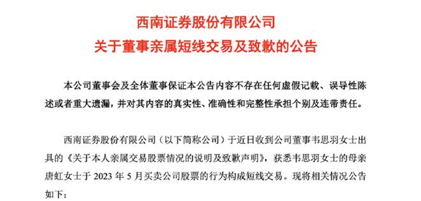 不过早在9月6日,西南证券就发布了关于董事亲属短线交易及致歉的公告。