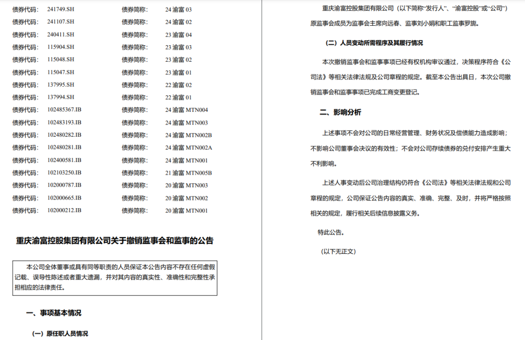 今年1月6日,渝富控股宣布撤销监事会和监事,涉及原监事会主席向远春、监事刘小娟和职工监事罗旎。