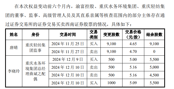 轻纺集团监事唐晴,在2024年11月25日以4.65元/股的交易价格买入9,100股“西南证券”;两天后清仓卖出9,100股,交易价格为4.7元/股,略有盈利。