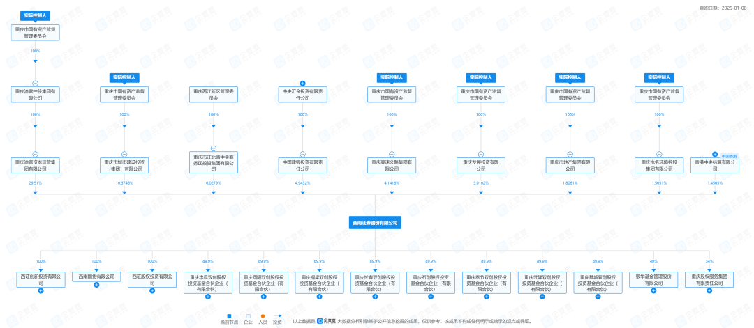 前述公告显示,渝富控股持有渝富资本100%股权,重庆水务环境控股集团有限公司(简称:水务环境集团)80%股权(尚未完成变更登记),重庆轻纺控股(集团)公司(简称:轻纺集团)80%股权。渝富资本、水务环境集团和轻纺集团分别持有西南证券29.51%、1.50%和0.41%的股权。渝富控股与渝富资本、水务环境集团及轻纺集团为一致行动人,合计持有西南证券31.42%股权。西南证券的实际控制人为重庆市国有资产监督管理委员会。