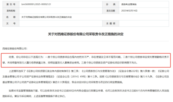 不到一个月后,2月14日,证监会官网发布了《关于对西南证券采取责令改正措施的决定》。决定书显示,西南证券在债券项目上存在多个违规行为,其中包括了个别公司债券项目合规内控把关不严,存在差错及立项不规范等。