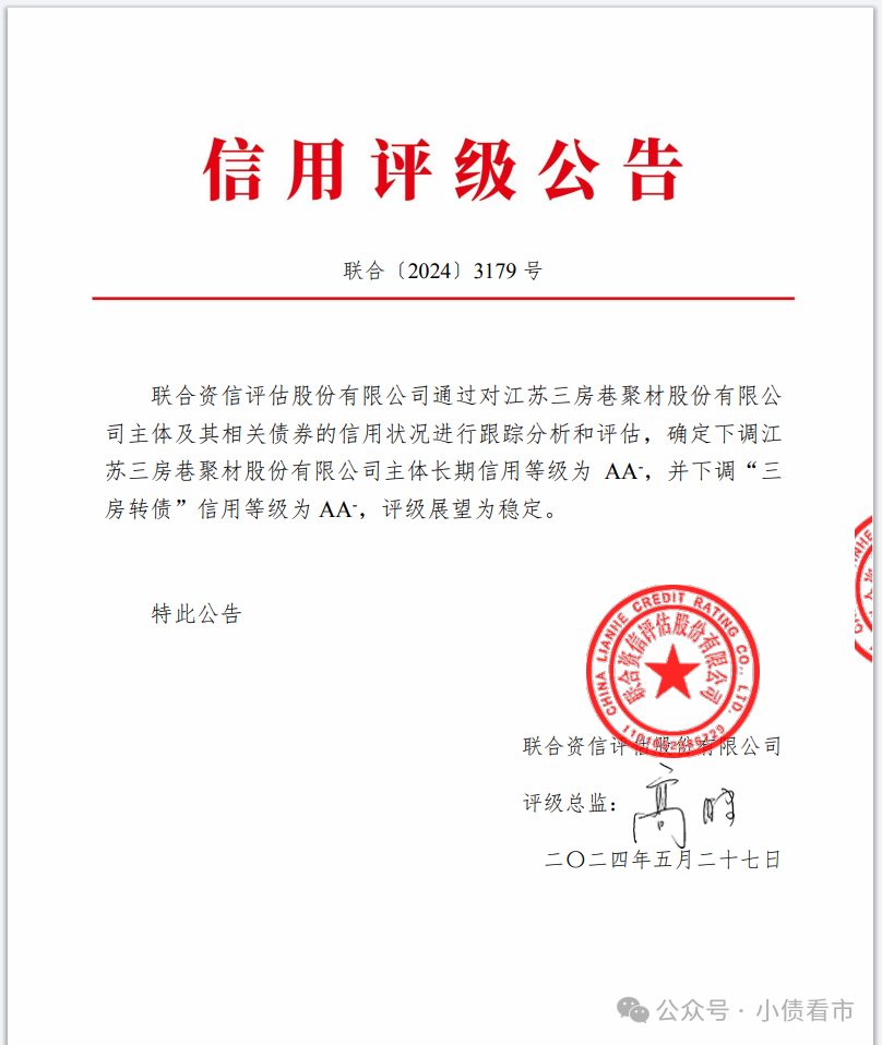 近日,联合资信公告称,下调三房巷(600370.SH)主体长期信用等级为AA-,并下调“三房转债”信用等级为AA-,评级展望为稳定。