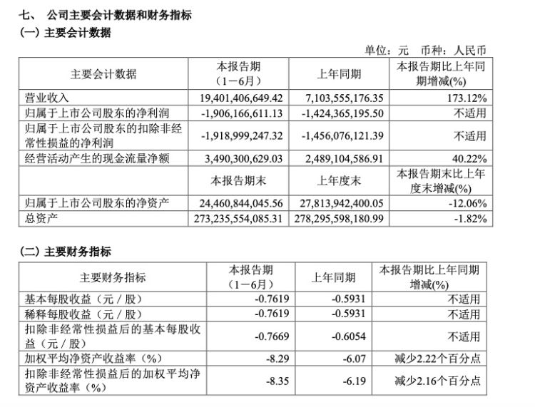 北京首都开发股份有限公司(以下简称“首开股份”或“公司”)8月25日发布2023年半年度报告称,公司营收增长净利减少,实现营业收入194.01亿元,同比增加173.12%;归属于上市公司股东的净利润-19.06亿元,上年同期为-14.24亿元。