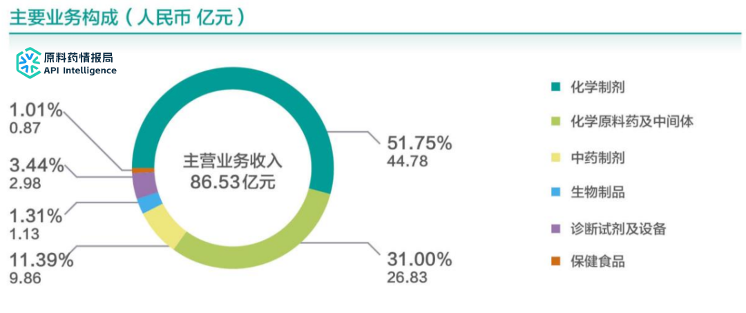 根据公告,化学制剂和化学原料药及中间体占比超过80%,其中化学制剂营收44.78亿元占比51.75%,化学原料药及中间体营收26.83亿元,占比31%。