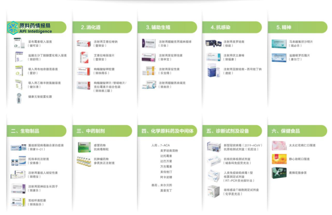 健康元主要从事医药产品及保健食品研发、生产及销售,业务范围涵盖化学制剂、生物制品、化学原料药及中间体、中药制剂、诊断试剂及设备、保健食品等多重领域。主要代表产品如下: