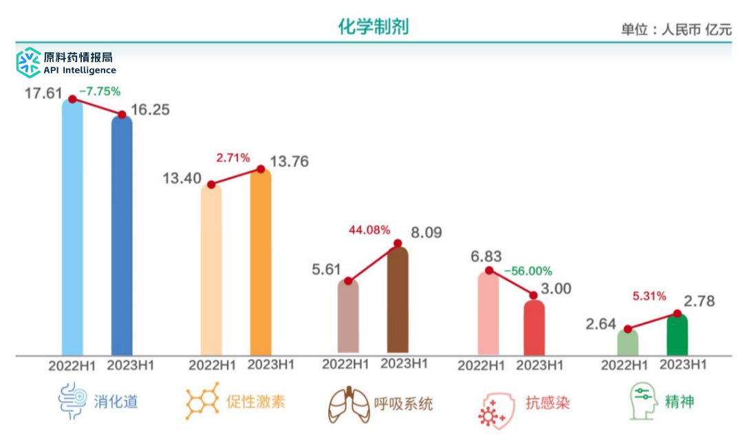 化学制剂方面,消化道(-7.75%)、抗感染(-56%)方面有所下滑,促性激素(+2.71%)、呼吸系统(+44.08)、精神(+5.31%)方面有所增长。