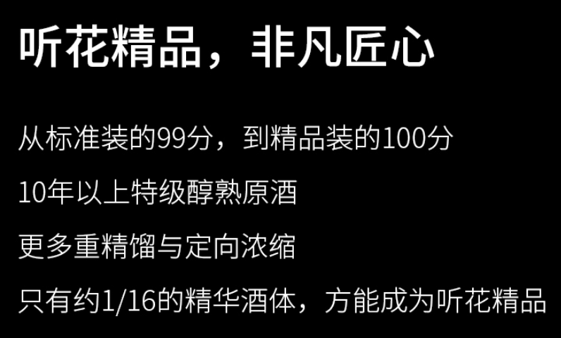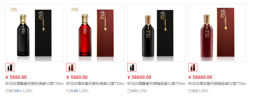 如图,在京东听花酒水旗舰店中,目前共有四款在售商品,听花酒分为酱香风格与浓香风格,标准版售价均为5860元/瓶,精品版售价则高达58600元/瓶,据介绍,其精品版选用10年以上特级醇熟原酒,经过更多重精馏与定向浓缩,只有约1/16的精华酒体才能成为听花精品。