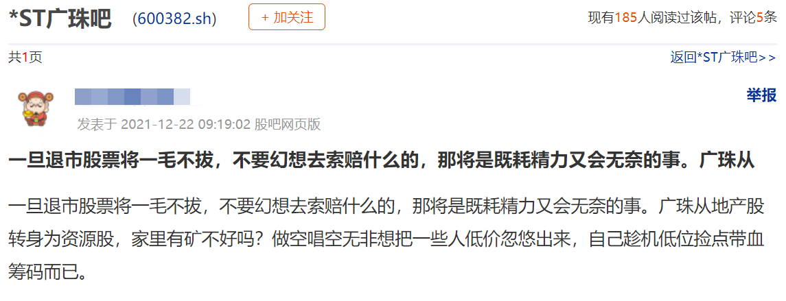 “一旦退市股票将一毛不拔,不要幻想去索赔什么的,那将是既耗精力又会无奈的事。广珠从地产股转身为资源股,家里有矿不好吗?做空唱空无非想把一些人低价忽悠出来,自己趁机低位捡点带血筹码而已,我自己守好我自己的筹码,并投上赞成票。”