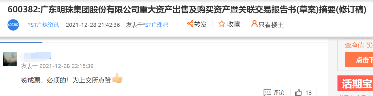 12月29日,广东明珠(*ST广珠,600382)将举行股东大会审议重大资产重组方案。经过回复上交所三次问询的补充披露,投资者对广东明珠此次重组方案更加理解和认可,东财股吧投资者热烈反应。29日,广东明珠开盘即涨停,报5.75元/股。