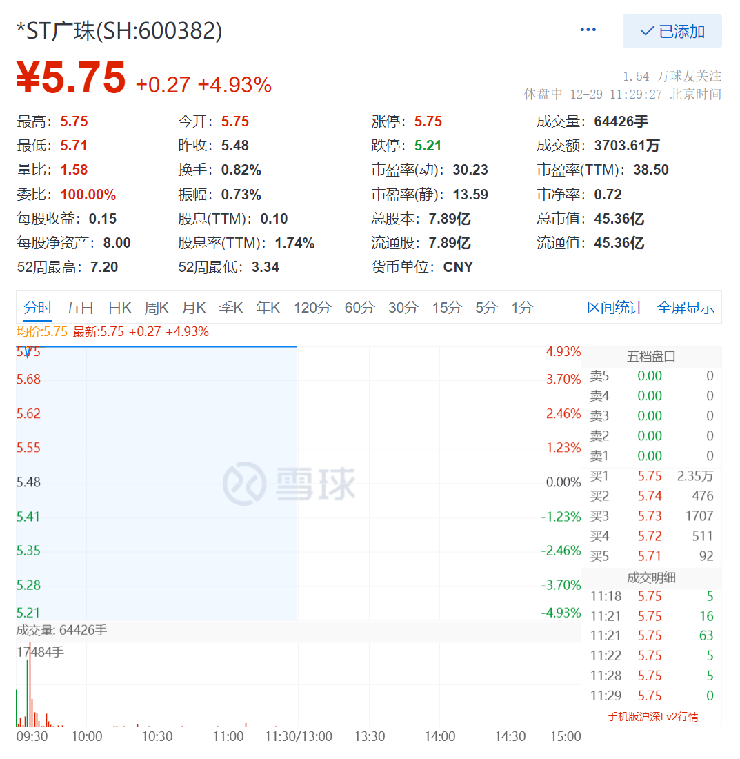 或由于实控人新增承诺保障给了投资者充足信心,今日*ST广珠开盘即涨停,涨4.93%报5.75元/股,截至11点30午间收盘,该股有2.25万手封单,成交超3700万元。