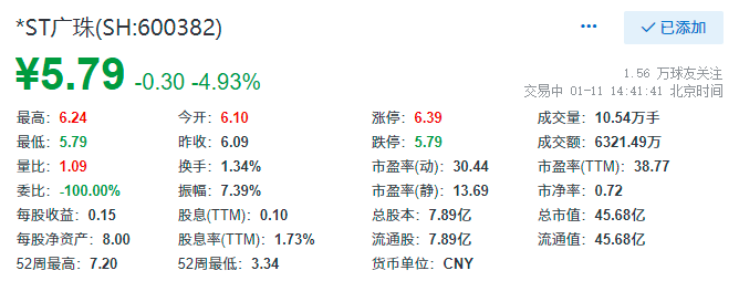 1月11日,截止14:41分,*ST广珠(SH600382)跌停,下跌4.93%,现报5.79元,成交额6321.49万元,总市值45.68亿元。