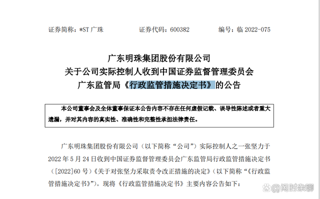 同天公告的还有,*ST广珠的实际控制人之一张坚力先生也于2022年5月 24日收到中国证券监督管理委员会广东监管局行政监管措施决定书。张坚力先生作为*ST广珠实际控制人,未能按期履行承诺,也未及时、充分披露不能按承诺置换相关未收回款项的风险信息,违反了《上市公司信息披露管理办法》(证监会令第182号)第三条和《上市公司监管指引第4号——上市公司实际控制人、股东、关联方、收购人以及上市公司承诺及履行》的相关规定。