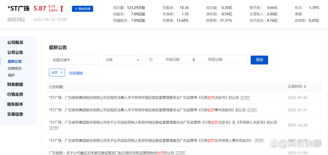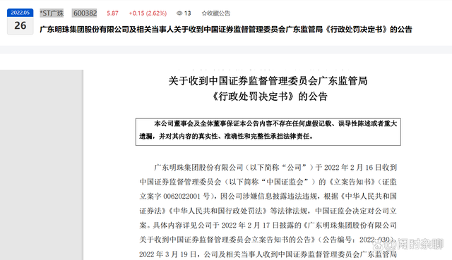 2022年5月25日,*ST广珠( 600382)发布盘后公告:公司及相关当事人收到中国证券监督管理委员会广东监管局《行政处罚决定书》。