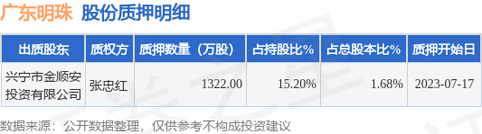 广东明珠(600382)7月19日公开信息显示,股东兴宁市金顺安投资有限公司向张忠红合计质押1322.0万股,占总股本1.68%。质押详情见下表: