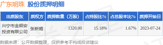 广东明珠(600382)7月26日公开信息显示,股东兴宁市金顺安投资有限公司向张新媚合计质押1320.0万股,占总股本1.67%。质押详情见下表: