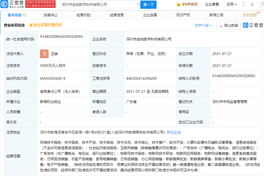 企查查APP显示,7月21日,深圳市金地数字科技有限公司成立,法定代表人为王骏,注册资本5000万元人民币,经营范围包含:物联网技术研发;物联网应用服务;信息系统集成服务;第一类增值电信业务;第二类增值电信业务等。