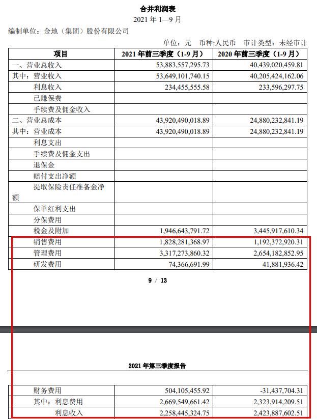 今年前三季度,金地集团销售费用为18.28亿元,同比增长53.33%;管理费用33.17亿元,同比增长24.98%;财务费用5.04亿元,去年同期为- 3143.77万元。其中,利息费用26.70亿元,利息收入22.58亿元。