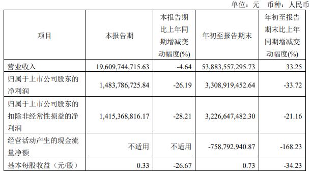 今年第三季度,金地集团实现营业收入196.10亿元,同比减少4.64%;归属于上市公司股东的净利润14.84亿元,同比减少26.19%;归属于上市公司股东的扣除非经常性损益的净利润14.15亿元,同比减少28.21%。