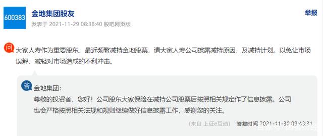 今年11 月 13 日—12月9日,大家人寿已累计减持金地集团股份2.26亿股,占公司总股本比例达到5%;权益变动后,其持有公司股份比例下降至10.43%。