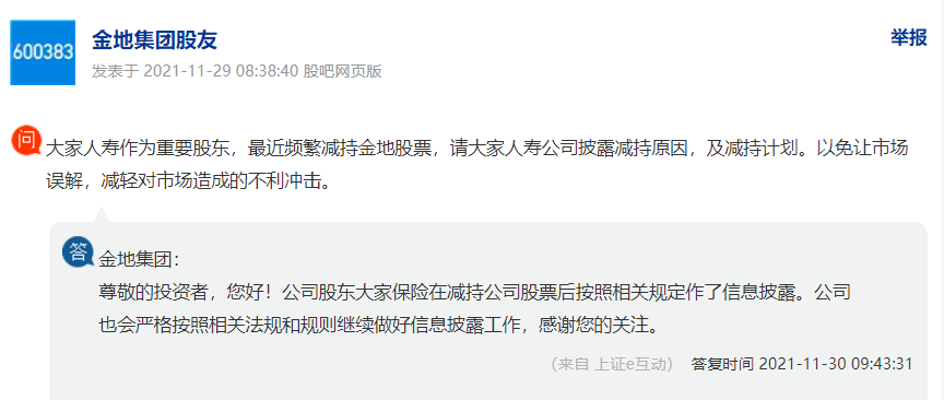 今年11 月 13 日—12月9日,大家人寿已累计减持金地集团股份2.26亿股,占公司总股本比例达到5%;权益变动后,其持有公司股份比例下降至10.43%。