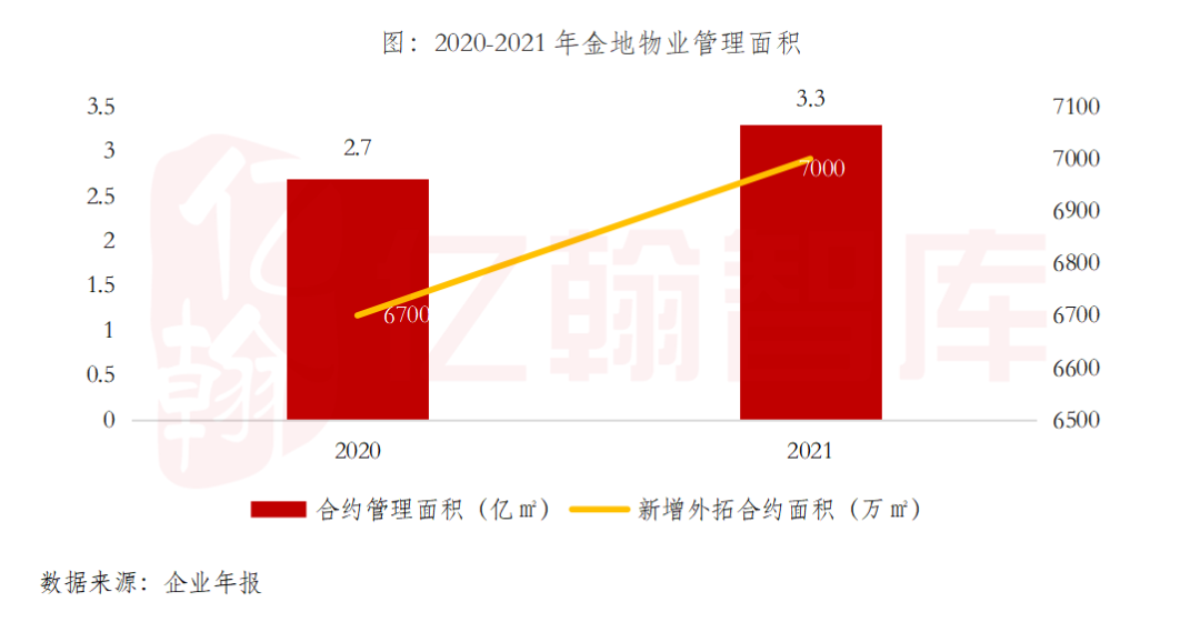 2021年“金地物业”正式更名为“金地智慧服务”,充分挖掘“互联网+物联网”的科技应用。年报数据显示,2021年金地智慧服务通过单项目拓展和收并购双轮驱动,新增外拓合约面积超7,000万平方米。截止2021年末合约管理面积突破3.3亿平方米,其中外拓占比高达71%,非住业态占比达15%。