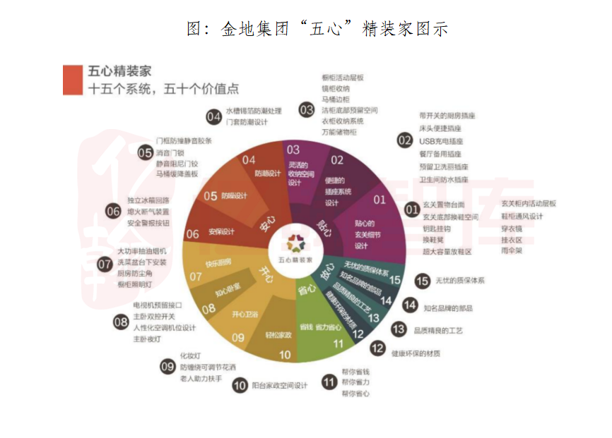 金地集团“五心”精装家。基于对传统住宅装修的系统提炼与归纳,提出五心精装标准,以贴心的家、安心的家、开心的家、省心的家、放心的家为五大准则,提供品味与品质兼具的全屋精装定制,形成3大标准,17大系统,115个细节。