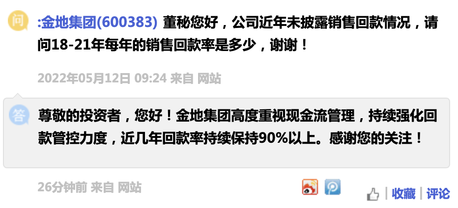 5月18日,金地集团(600383.SH)在互动平台回复投资者关于“18-21年每年的销售回款率”提问时表示,金地集团高度重视现金流管理,持续强化回款管控力度,近几年回款率持续保持90%以上。