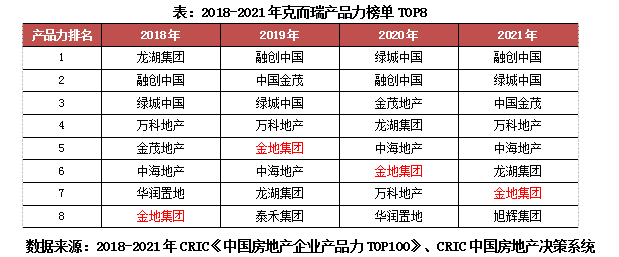 不断扩充的产品线推动了城市深耕的进程,目前金地已形成“格林”、“褐石”、“名仕”、“天境”、“世家”、“风华”、“未来”、“社区商业”、“峯汇”等九大产品系列,其中峯范系列入选全国十大轻奢产品系,青岛华章、上海金地峯范分别入选克而瑞十大轻奢作品、十大品质作品。根据2018-2021年CRIC《中国房地产企业产品力TOP100》榜单中,金地始终保持TOP8水平,不仅提升品牌影响力,也提升了客户的忠诚度。
