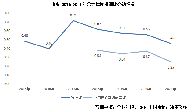 从金地的投资历程看,金地不断调整拿地节奏,试错中逐渐把握投资销售的动态平衡。在迷茫期内,金地投资节奏并不稳定,投销比大幅波动,在市场火热时高价拿地,在地价低迷时错失低价良机,直至步入千亿房企之列后,才找到适合自身发展的拿地节奏。金地从2015年开始,加大市场研究力度,并强化营销体系建设,从投销两端同时调整节奏,并在“稳增长”和“去库存”政策加持下,投销比逐渐趋稳,维持在40%-60%之间,保持稳健谨慎的投资策略。成为千亿房企后,2017年金地提出“深耕广拓”的投资策略,积极把握拿地窗口期,适当扩充土储,同时受行业政策不断趋紧的影响,投销比不断下降,但仍高于百强房企平均水平。