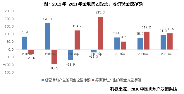 在现金流入方面,金地集团销售商品、提供劳务收现总额虽然在2018年和2020年呈现同比的下降,但整体上来看,仍然保持着随规模扩张稳步增长的趋势,尤其值得关注的是,2021年企业销售商品、提供劳务收现总额同比增31.8%,首次突破1000亿。