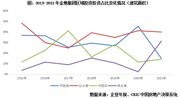 从投资区域分布上看,金地围绕三大城市圈形成“东密西强”的投资布局,其中金地集团在珠三角和长三角两个区域内投资力逐渐增加,环渤海和中西部的布局上更多选择省会城市,比如武汉、长沙等。整体来看,2015-2017年金地在环渤海和长三角地区的投资比重相对较高,从2018年开始,逐渐加大对珠三角和长三角地区的投资,长三角投资占比达到38%,珠三角地区的投资力度也从8%提升至15%,截止2021年底,金地在长三角、珠三角的投资占比超七成,一方面由于长三角、珠三角市场更加活跃,因此该地区三四线城市的市场潜力更易被挖掘,另一方面,金地在珠三角地区布局仍有空间,金地集团的资源逐渐向该地区倾斜。与此同时,金地在环渤海和中西部地区内的投资以区域内的高能级城市为主,2015-2021年金地在环渤海和中西部区域内一二线城市投资占比为93%,主要布局西部强市。